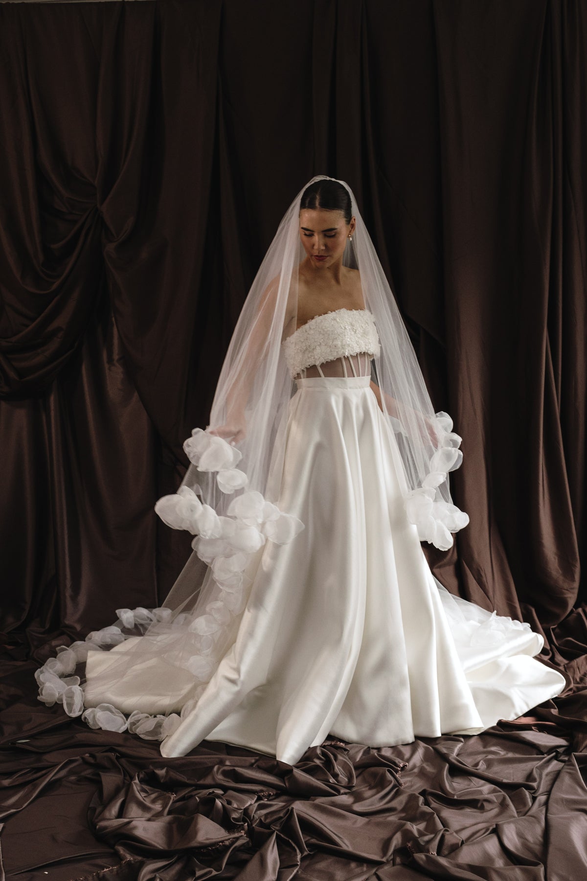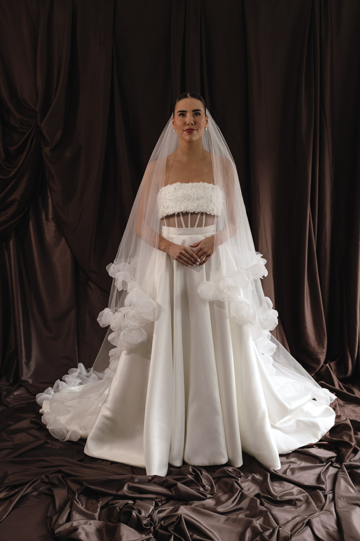Each floral appliqué is individually handcrafted, creating subtle dimension across the tulle. Paired with a graceful blusher, she frames the face with lightness while allowing the silhouette to remain fluid and refined.